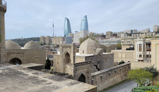 Panoramic views of Baku Bay and the Flame Towers with historic memorials nearby.